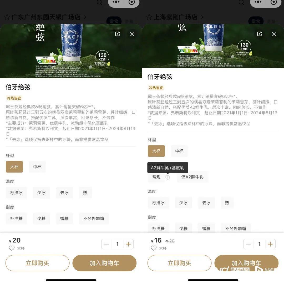 针对网友关注的去除基底乳饮品价格是否会变动,南都湾财社记者发现,饮品价格保持一致,大杯伯牙绝弦在优惠前的价格均为20元。